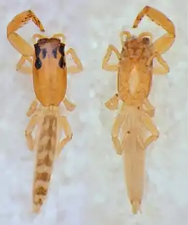 Мелкие пауки-скакуны оранжево-коричневого цвета, длина менее 1 см. Самцы: головогрудь в основном коричневая с серыми волосками; брюшко очень узкое и вытянутое, коричневое; вентер и узкий клипеус коричневые; хелицеры, максиллы и лабиум коричневые; стернум светлый; первая пара ног коричневая, другие ноги и педипальпы серовато-оранжевые. Самки: тело очень узкое и длинное; головогрудь оранжевая; вокруг глаз чёрные отметины, волоски серые; брюшко серое; клипеус и хелицеры оранжево-серые; педипальпы желтоватые; максиллы и лабиум оранжево-серые; стернум желтоватый; вентер серый; все ноги серовато-оранжевые[1].