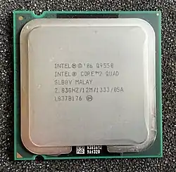 Core 2 Quad — четырёхъядерный процессор компании Intel. Процессор под этой маркой появился в январе 2007 г. и был основан на дизайне ядер Kentsfield, производился по 65-нм техпроцессу и носил имя Intel Core 2 Quad Q6600, имел тактовую частоту процессора 2400 МГц, 1066 МГц на системной шине и размер L2 кэша, равный 8 Мб. Первый четырёхъядерный процессор Intel анонсировал ещё осенью 2006 г. - Core 2 Extreme QX6700 с тактовой частотой процессора 2667 МГц и разблокированным множителем. Чуть позже уже в 2007 г. появились обновленные модели: Core 2 Quad Q6700 с частотой процессора 2667 МГц и Core 2 Extreme QX6800 2933 МГц и частотой шины 1066 МГц; позже, в том же 2007 г., добавили QX6850 с частотой 3000 МГц и с достаточно высокой частотой шины 1333 МГц — это был самый мощный и самый последний из процессоров дизайна Kentsfield. Уже в марте 2009 г. чипы Kentsfield перестали производить. В начале 2008 г. Intel значительно увеличил ассортимент четырёхъядерных процессоров для LGA775, и в продажу поступили процессоры, модели которых начинались уже с девятки: Q9400, Q9450 и Q9550 на основе обновленного дизайна ядер Yorkfield, которые уже начали производить по 45-нм техпроцессу. Среди важных улучшений были: новый набор инструкций SSE4.1, увеличение кэша L2 с 8 Мб до 12 Мб и частоты шины от 1333 МГц до 1600 MHz у Core 2 Extreme, также некоторые модели Core 2 Quad и Core 2 Extreme выпускались для сокета LGA771, которые применялись в том числе в брендовых дорогих игровых компьютерах Dell Alienware и Acer Predator. В 2009 Intel ещё продолжал наполнять модельный ряд процессоров Core 2 Quad с дизайном Yorkfield, даже несмотря на выход под конец 2008 г. абсолютно новых процессоров, которые значительно отличались от дизайна ядер Yorkfield, под новой маркой Core i7 с новым дизайном ядер Bloomfield и новым сокетом LGA 1366. Процессоры Core 2 Quad с дизайном ядер Yorkfield производились до 07.02.2011.