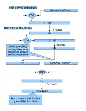 - для каждого b-байтового блока части сообщения: выполняется операция исключающего «ИЛИ» над блоком и первыми b байтами состояния и затем преобразует его посредством r одинаковых раундов
