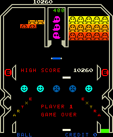 В центре экрана находятся символы с грустными лицами, и прикосновение к ним мяча приводит их к «счастливому» виду[2]. Когда все символы в ряду находятся в «счастливом» состоянии, множитель очков увеличивается[1]. При касании каждого из буквенных символов, расположенных по обеим сторонам экрана, или при столкновении мяча с зелёными блоками, расположенными в нижней части экрана, начисляется дополнительный мяч[1][2]. Когда мячик касается нижней ракетки, все полностью убранные формации блоков восстанавливаются и количество Минимонов на экране увеличивается[1].
