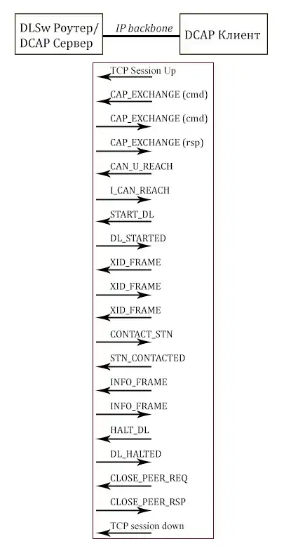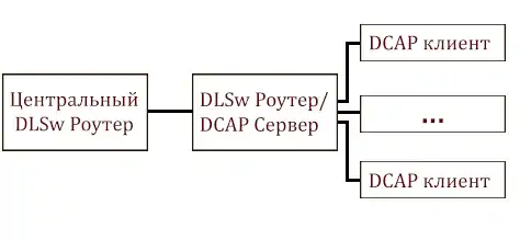 Рабочие станции (клиенты DCAP) и маршрутизатор (сервер DCAP), устанавливают отношения типа Клиент/Сервер. Рабочие станции подключаются только к серверу DCAP. В свою очередь, у сервера есть единственное равноправное соединение — с центральным роутером.
