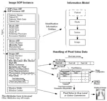 DICOM-файл — объектно-ориентированный файл с теговой организацией, информационная модель стандарта DICOM для DICOM-файла четырёхступенчатая: