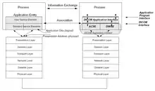 Сетевой DICOM-протокол использует TCP/IP для передачи медицинской информации от медицинского оборудования в PACS и для связи между PACS. Протокол трёхуровневый — нижний, сразу над TCP — DUL (DICOM Upper Layer); над ним — сервисы: DIMSE (DICOM Message protocol) и ACSE (Association Control protocol — standard OSI protocol); и выше — DICOM Application Interface. Над ними расположено приложение (Medical Imaging Application).
