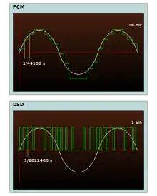 Аналоговый звуковой сигнал конвертируется в цифровой с помощью дельта-сигма модуляции при частоте дискретизации 2,8224 МГц (в 64 раза больше, чем у CD Audio), но с разрешением всего 1 бит, в отличие от используемых в формате CD 16 бит при частоте 44,1 кГц. Преобразование, при котором отсчёты аналогового сигнала берутся с частотой, многократно превышающей верхнюю граничную частоту сигнала, называется передискретизацией (англ. oversampling).