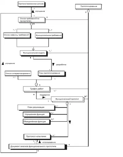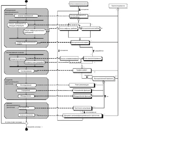| Анализ прототипа | Собираются комментарии пользователей и документация. Они будут играть важную роль при разработке документа анализа прототипа. На основе этого документа будет проведено обновление списка требований и протокол возможных рисков, а также будет принято решение проводить или нет ещё одной итерации стадии создания функциональной модели. |