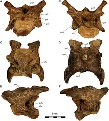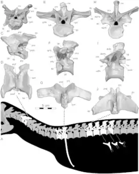 Авторы описания установили несколько уникальных производных особенностей, аутапоморфий. Шейный позвонок имеет тонкий слой, костный лист, между презигапофизом (передним соединительным отростком) и эпипофизом (задним соединительным отростком); край костного листа заметно выпуклый. Выпуклая часть длиннее, чем тело позвонка, и отделена от обоих отростков заметными выемками. Первый и второй грудные позвонки, презигапофиз и костная пластинка между ним и телом позвонка расположены на вертикальной линии; сочленение презигапофиза и передней поверхности тела позвонка располагаются в той же плоскости. Начиная со второго спинного позвонка, сочленения задних соединительных отростков сильно вогнутые. По крайней мере, с шестого спинного позвонка и дальше впадина ниже презигапофиза разделяется на два меньших углубления[1].