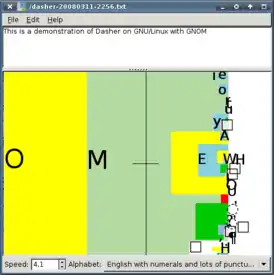 Dasher — свободная программа для предиктивного набора текста. Она позволяет пользователям вводить текст без использования клавиатуры, при помощи любого указательного устройства, будь то мышь, тачпад, сенсорный экран, трекбол или джойстик. Приложение может оказаться полезным пользователям, которые не могут использовать клавиатуру, или пользователям мобильных устройств.