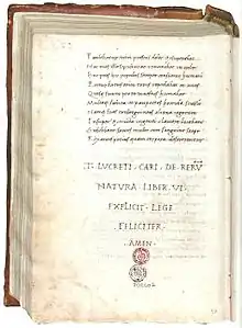 Первое печатное издание De rerum natura было выпущено в Брешии, Ломбардия, в 1473. Вскоре появились и другие печатные издания книги[2].