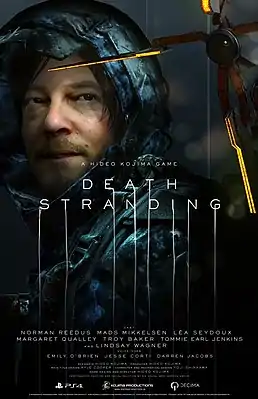 Death Stranding (яп. デス・ストランディング) — компьютерная игра в жанре action с открытым миром[6], разработанная студией Kojima Productions при поддержке Guerrilla Games и изданная Sony Interactive Entertainment для PlayStation 4 в 2019 году[7]; в 2020 году компания 505 Games выпустила версию игры для Microsoft Windows[8]. Это первая игра Хидэо Кодзимы и Kojima Productions после разрыва с Konami в 2015 году. В работе над игрой приняли участие актёры Норман Ридус, Мадс Миккельсен, Леа Сейду, Маргарет Куэлли, Томми Дженкинс, Линдси Вагнер и Трой Бейкер[9]; в игре также появляются персонажи, моделями для внешности которых послужили кинорежиссёры Гильермо дель Торо и Николас Виндинг Рефн.