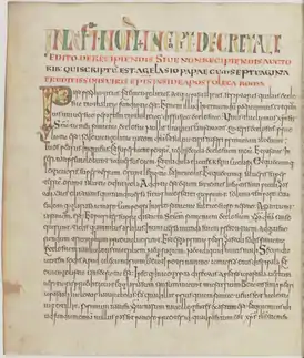 ![]() Decretum Gelasianum. Рукопись второй половины 8 века: «Collectio canonum Sancti Blasii» («Собрание правил святого Власия»). Национальная библиотека Франции | |