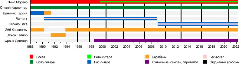 - Чино Морено — вокал (1988 — наши дни), ритм-гитара (1999 — наши дни)