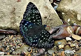 Крупные дневные бабочки. Длина переднего крыла самцов 32—33 мм, самок — 30—39 мм. Крылья сверху чёрного цвета с синеватым отливом и у самцов и у самок, тёмные с белыми пятнышками. В гениталиях самца саккус в 2 раза короче высоты гениталий. Вальвы на вершине округлены, равномерно изогнут, близ вершины с зубцами[1].