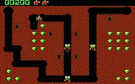 В начале уровня диггер появляется внизу в центре экрана, а ноббины по одному появляются с правом верхнем углу. Они не могут рыть тоннели, а способны только перемещаться по существующим. Однако, данные существа могут со временем превратиться в хоббинов (англ. Hobbins), которые могут рыть туннели, съедать изумруды и мешки золота, и тем самым более агрессивно преследуют землекопа. Для борьбы с монстрами «Diggermobile» может стрелять огненным шариком (англ. fireball), который летит по горизонтали или вертикали и, если встречается с монстром, то взрывается и уничтожает всех монстров в клетке (как правило, одного). После выстрела землекопу нужна перезарядка, которая происходит через некоторое время[1].