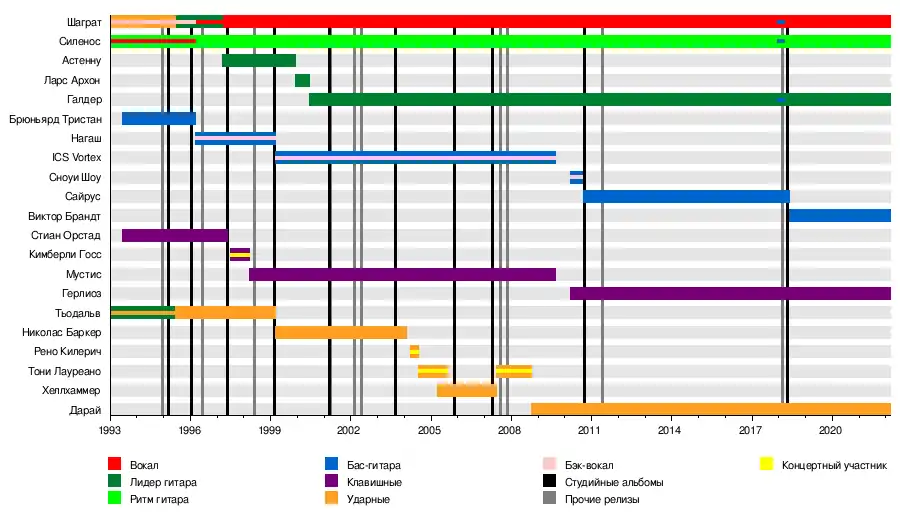 - ICS Vortex (норв. Simen Hestnæs) — бас-гитара, чистый вокал (2000—2009)[3][4]