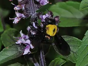 ![]() Самка пчелы Xylocopa pubescens с симбиотическими клещами Dinogamasus sp., расположившимися на специализированной структуре акаринариуме. | ||||||||||||||||||||