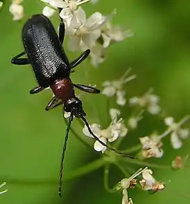 Надкрылья сильно блестящие с синим или зелёным металлическим отливом[1].