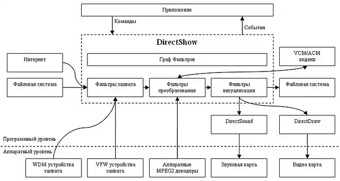 Поддерживает также различные форматы файлов, от WAV и AVI до Windows Media. Является заменой более ранней технологии Microsoft — Video for Windows.[1] Основан на Microsoft Windows Component Object Model (COM), DirectShow предоставляет общий интерфейс работы с мультимедиа поддерживаемый большинством языков программирования. Кроме того, DirectShow расширяем и позволяет поддерживать устройства, форматы и компоненты обработки сторонних производителей. Средства разработчика и документация ранее распространялись как часть DirectX SDK, в настоящее время они распространяются совместно с Platform SDK, которая в свою очередь входит в состав Windows SDK.[2] В будущем Microsoft планирует замену DirectShow на Media Foundation.