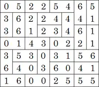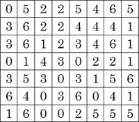 Играть в неё может любое число игроков, но мы допустим, что их двое. Каждый поступает следующим образом. Пока противника нет в комнате, он перемешивает стандартный набор из 28 домино, точками вниз, и случайным образом формирует из них прямоугольник 7×8. Затем кости переворачиваются и цифры на них переносятся в таблицу 7×8, но при этом не показывается расположение отдельных костей… Игроки обмениваются таблицами, и тот из них, кто первым догадывается, как воспроизвести это расположение цифр костяшками домино, выигрывает. Поскольку для многих вариантов расположения цифр на сетке 7×8 есть несколько решений, не обязательно воспроизводить именно исходное расположение костей — достаточно, чтобы оно соответствовало расположению цифр в таблице.