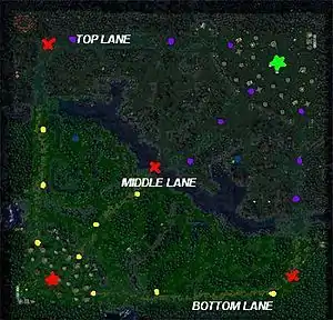 DotA — командная тактико-стратегическая игра с элементами компьютерной ролевой игры, в которой каждый игрок управляет одним героем, и, если герой имеет соответствующие способности, некоторым количеством дополнительных существ. Во время игрового процесса, с течением времени и в зависимости от успешности своих действий игрок получает опыт, открывая новые способности своего героя, и деньги, которые он тратит на покупку различных предметов. Основная задача игры для каждой из двух команд — уничтожить вражеский лагерь, защищённый башнями. Игроки контролируют только своего героя (и, возможно, несколько призванных или захваченных существ); героям помогают юниты, управляемые компьютером, которые называются «кри́пы» (англ. creeps)[3].