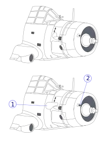 На самолёте лидера звена в цвет звена окрашивалось кольцо шириной 18 дюймов[24], опоясывающее носовую часть обтекателя двигателя и вертикальная полоса шириной 20 дюймов[24] на хвостовой части фюзеляжа, которая пересекала бортовой номер по центру. На втором самолёте звена в закреплённый за звеном цвет закрашивалась верхняя половина кольца на двигателе, на третьем — нижняя половина. На фюзеляже вторая и третья машина вертикальных полос не имели[23].