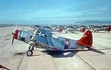 Верхняя поверхность крыла была цвета «жёлтый хром». Корневую часть каждой консоли крыла по диагонали пересекала полоса закреплённого за авианосцем цвета[23] шириной 406 мм[24]. Сверху и снизу на законцовках крыла наносился стандартный шеврон палубной авиации США — на синем круге диаметром 1397 мм белая пятиконечная звезда с красным кругом в центре[24]. На фюзеляже этого шеврона не было, так как для опознания считалось достаточным наличие бортового номера[25].