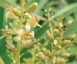 Цветки с лепестками кремово-зелёного или кремово-жёлтого цвета; тычинки ярко-оранжевые[2].