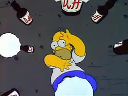 На Гомера падают сотни пивных бутылок из дирижабля „Дафф“, и он пытается избавиться от соблазна | |
