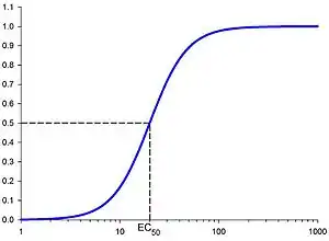 EC50 или полумаксимальная эффективная концентрация, означает концентрацию лиганда, которая вызывает эффект, равный половине максимального возможного для данного лиганда после истечения некоторого промежутка времени. Данная величина обычно используется в качестве характеристики мощности действия лиганда[1].