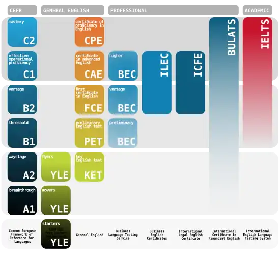 Кембриджские экзамены ESOL связаны с CEFR. Таблица соответствия ESOL CEFR[1] показана ниже: