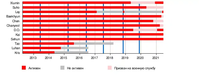 Сиумин Сухо Лэй Пэкхён Чен Чханёль D. O. Кхаи Сехун |