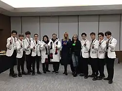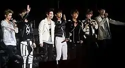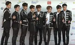 ![]() EXO в августе 2016 года. Слева направо (сверху): Бэкхён, Чен, Лэй, Сехун, Чханёль, D.O., Кхаи. Слева направо (снизу): Сухо, Сиумин | |