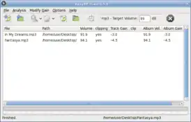 easyMP3Gain — компьютерная программа для нормализации громкости mp3, ogg и aac файлов. Является графическим интерфейсом к программам: MP3Gain[1], VorbisGain и AACGain.
