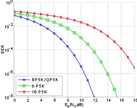 График средней частоты ошибок при передаче (BER) в зависимости от Eb/N0 для разных методов модуляции. Из графиков видно, что квадратурная фазовая манипуляция и двоичная фазовая манипуляция позволяют передавать большее количество данных, чем другие представленные модуляции при прочих равных условиях.