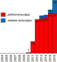Открыт 1 радиопульсар (PSR J1859+03) и 4 гамма-пульсара (PSR J0554+3107, PSR J1422-6138, PSR J1522-5735, PSR J1932+1916).
