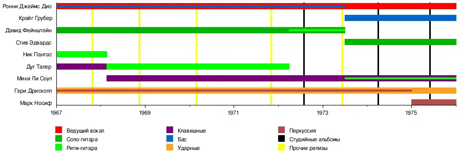 Дио был вокалистом Rainbow вплоть до конца 1978 года, когда разногласия относительно дальнейшего пути группы побудили Блэкмора уволить Дио. После этого он становится вокалистом Black Sabbath, откуда уходит в 1982-м. После этого он основывает свой проект под названием Dio, с которым выступал до конца 2009 года. После этого у него был диагностирован рак желудка. Хотя первый сеанс химиотерапии прошел удачно, 16 мая 2010 года Ронни Джеймс Дио уходит в мир иной. Вокалист был одной из самых видных фигур хэви-металлической сцены.