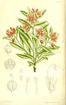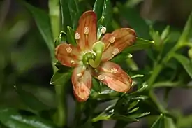 Цветки двуполые, пятичленные, радиально-симметричные, с двойным околоцветником. 5 чашелистиков срастаются в ланцетовидную чашечку 7—10 мм длиной и 2—4 мм шириной, с острым концом. 5 розовых или медных лепестков длиной 10—15 мм, почти эллиптической формы.
