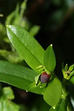 Очерёдно или спирально располагающиеся листья находятся на концах ветвей и разделены на черешок длиной 1—4 мм и листовую пластинку. Листовая пластинка простая, длиной 1,5—5 см и 0,6—1,4 см в ширину, от эллиптической до округло-ланцетовидной формы. Край листа гладкий, с двух сторон лист имеет голубовато-зелёный цвет.