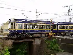 Линию обслуживает единственное депо рядом с платформой Гокуракудзи. Подвижной состав на линии насчитывает 15 составов 9 уникальных типов: самые старые вагоны (300 серия) выпущены в 1960 году. Также на линии работают современные поезда стилизованные под ретро, например, внешний вид состава 10 серии напоминает Восточный экспресс.