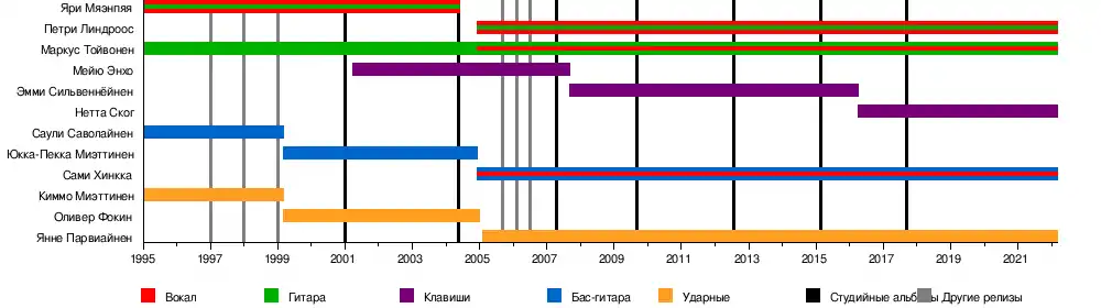 - Маркус Тойвонен — лидер группы, соло и ритм-гитара, чистый и бэк-вокал (1995—настоящее время)