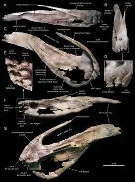 Голотип MSC 7949 найден в слое формации Mooreville Chalk, который датируют поздним сантоном, около 83 млн лет назад[2], штат Алабама, США. Голотип включает в себя хорошо сохранившийся, почти полный, частично сочленённый череп и фрагментарный посткраниальный скелет. Череп включает в себя обе предчелюстные и челюстные кости, обе скуловые, частичную правую носовую кость, левую слёзную, левую предлобную, обе лобные, заглазничные и чешуйчатые кости, левую квадратную, частичную мозговую коробку, предзубную кость, обе зубные, надугловые и угловые кости, подъязычную кость и различные челюстные и дентарные зубы. Посткраниальный скелет представлен вторым шейным и несколькими шейными, грудными, крестцовыми и хвостовыми позвонками, частичной левой лобковой костью, частичной левой седалищной, частичной правой большеберцовой костью и двумя фалангами передней конечности. Поперечный гистологический срез большеберцовой кости, а также отсутствие полного срастания нейрокраниума и открытые нейроцентральные швы у шейных и передних спинных позвонков указывают, что особь на момент смерти ещё не достигла скелетной зрелости.