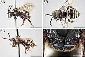 Мелкие слабоопушенные пчёлы, с беловато-жёлтыми отметинами на теле как у ос и рыжевато-красными ногами. Длина менее 1 см. Членик жгутика F2 не более чем 1.1 × в длину как в ширину; мезоскутум с отчётливыми перевязями; аксиллы мелкие , не выступают за середину длины мезоскутеллюма, и также как и мезоскутеллюм чёрные; мезоплеврон пунктированный. Клептопаразиты пчёл рода Colletes , в гнёзда которых откладывают свои яйца. На цветах Leucanthemum vulgare (Compositae), Plagiobothrys (Boraginaceae), Salix (Salicaceae). Максиллярные щупики 1-члениковые. 2-й стернит брюшка матовый. Брюшко частично красное. У самок на 6-м стерните брюшка расположены ланцетовидные, мелко зазубренные отростки. В переднем крыле три радиомедиальных ячейки, 1-я из них много крупнее 3-й. Вершина радиальной ячейки (по форме она эллиптическая) удалена от переднего края крыла. Задние голени со шпорами[1].