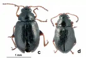 Окраска тела сверху чёрная с бронзовым блеском. Длина самок (2,1—2,2 мм) немного больше, чем самцов (1,7—1,8 мм). Ширина тела около 0,85 мм. Усики жёлтые, их последний, 11 сегмент, затемнён. Ширина глаз в 1,3 раза меньше расстояния между глазами. Лобный гребень узкий. Переднеспинка выпуклая удлинённая, её длина больше ширины. Она покрыта крупными редкими точками и по её боковой край только со щетинками, без зубчиков. Продольные борозды переднеспинки отчётливые, а передние боковые углы переднеспинки тупые. Переднеспинка и надкрылья без микроскульптуры. На надкрыльях расположены 11 рядов точек. Ряд точек, расположенный ближе к внутреннему краю надкрыльев заканчивается не доходя 1/3 их вершины. Бёдра тёмно-коричневые с жёлтыми вершинами, голени и лапки жёлтые. Эдеагус самцов параллельносторонний, на вершине закруглён. У самок последний стернит брюшка выпуклый, а копулятивная сумка сперматеки изогнута и сжата в середине[2][3].