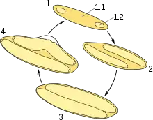 При делении у E. fishelsoni происходит внутреннее образование двух (реже более) дочерних клеток. Их рост начинается от концов материнской клетки и продолжается до тех пор, пока они не достигнут её длины. Далее зрелые дочерние клетки выходят из клеточной оболочки материнской клетки, сбрасывая её, как пустую шелуху. Подобным образом делится и близкородственная бактерия Metabacterium polyspora[2]. При формировании дочерних клеток деконденсированная ДНК, случайно расположенная в клетке, уплотняется обратно и формирует апикальные шапочки конденсированной ДНК. ДНК разделяется между дочерними клетками почти поровну[7].