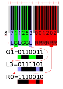Первая цифра (в иллюстрации к статье — цифра 8) кодируется не дополнительными штрихами, а способом кодирования левой половины штрихкода (10 разновидностей). Из таблицы видно, что для кодирования первой цифры используется немного разное начертание штрихов, обозначенное буквами L и буквами G. Определённое чередование этих кодов даёт сканеру на уровне логики определить 13 цифру. Например, для цифры «1» G-код у третьей, пятой и шестой цифры, то есть встретив код, в котором G-код левой части кода расположен в этом порядке, сканер в качестве первой цифры передаст в компьютер единицу. Для цифры «2» G-код у третьей, четвёртой и шестой цифры, соответственно сканер передаст в компьютер двойку. Для других цифр эта логика отображена в таблице.