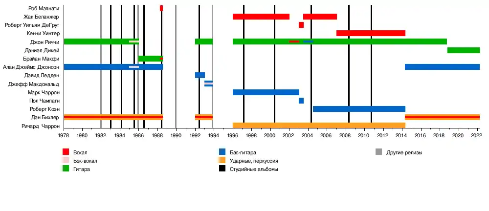 В 2018 году гитарист оригинального состава Джон Риччи ушёл из группы[2]. Новым гитаристом стал Дэниэл Дикей[2].