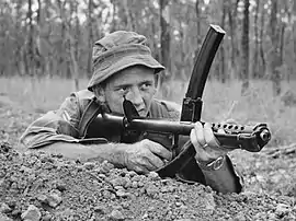 ![]() Австралийский солдат с автоматом F1 во время учений в 1967 году. | |