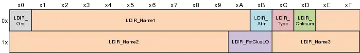 Файлы и каталоги с длинным именем (свыше 8.3) обрабатываются файловой системой FAT особым образом. Структура 32-байтовой записи для файла с LFN (Long File Name) отличается от обычной (SFN-записи):