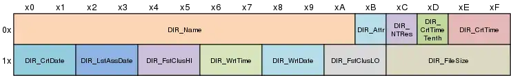 - DIR_LstAccDate. 2 байта по адресу 0x12. Дата последнего доступа к файлу (то есть последнего чтения или записи — в последнем случае приравнивается DIR_WrtDate). Аналогичное поле для времени не предусмотрено.
