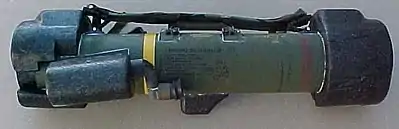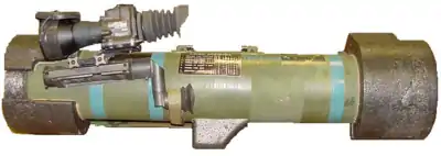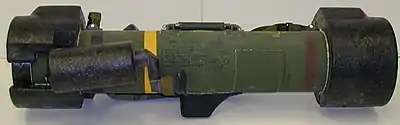 ![]() Пусковая труба с вмонтированными в корпус прицельными приспособлениями и рукояткой для переноски (внизу) и ракета MPIM с расправленным хвостовым оперением | |