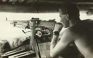 Военнослужащий ВМС США ведёт огонь из M240 с борта вертолёта. Тихий океан, 2003 год